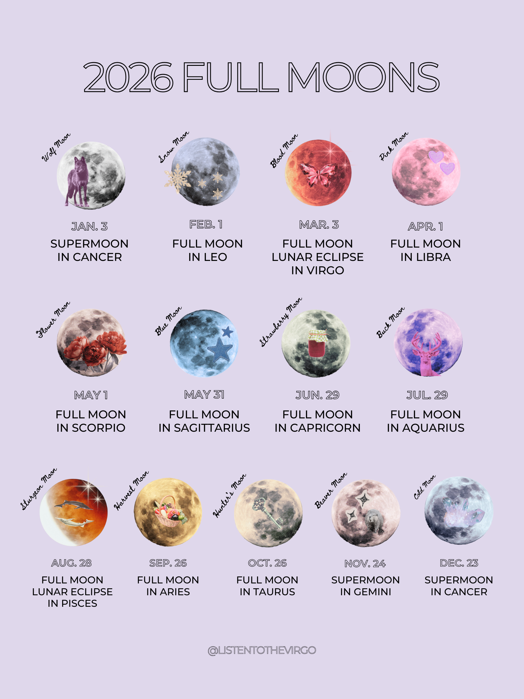 2026 Full Moons physical Print. This print features two different looks on each side, showcasing the names, signs, and dates of the 2026 New Moons.